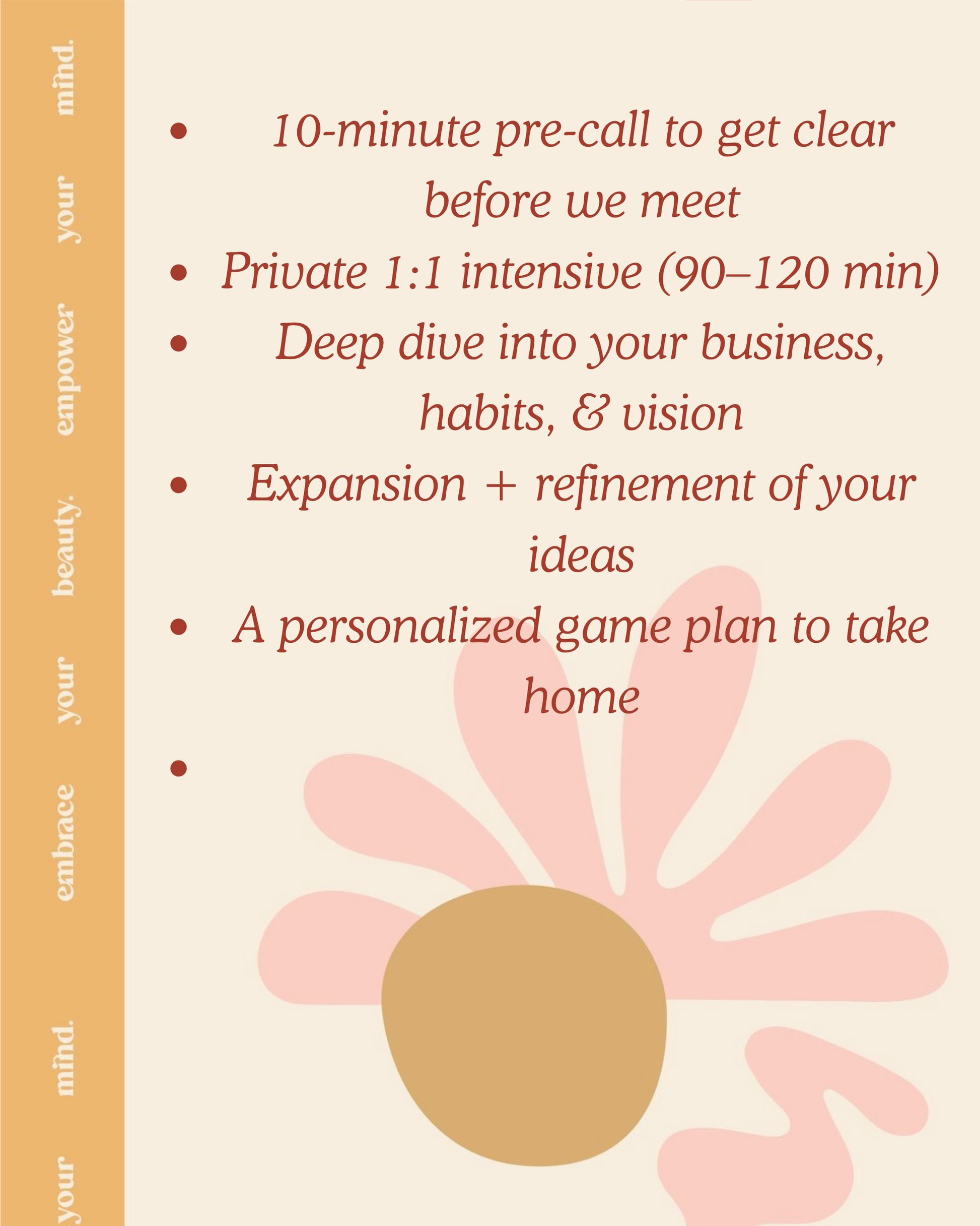 This session is rooted in honesty, care, and strategy — no fluff, no cookie-cutter answers. Just clarity, inspiration, and direction held in a way that feels safe, powerful, and true.