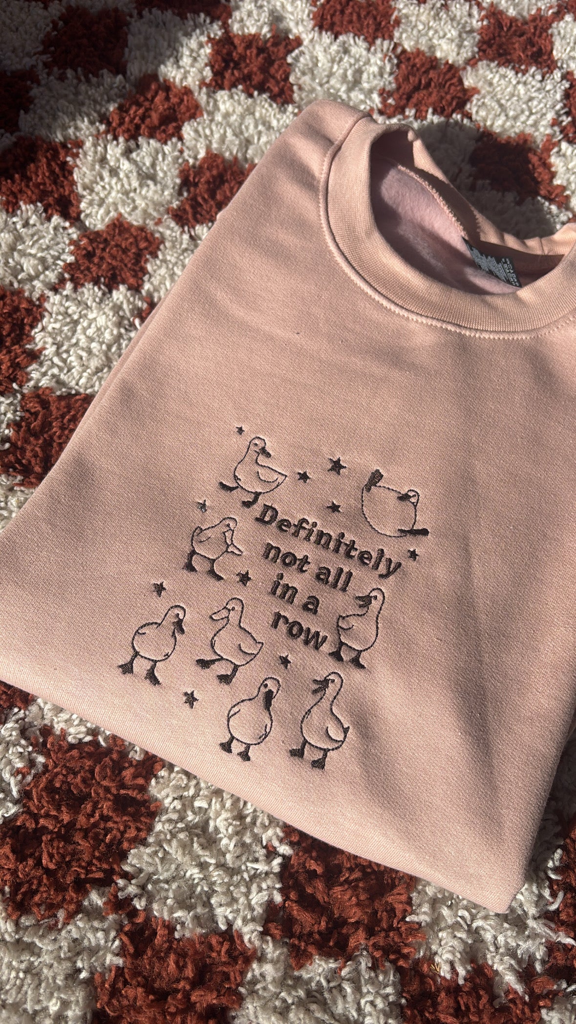 Featuring embroidered duck illustrations with the phrase Definitely not all in a row, this piece captures that perfectly imperfect energy. It is playful, honest, and self aware in a way that feels relatable rather than chaotic.