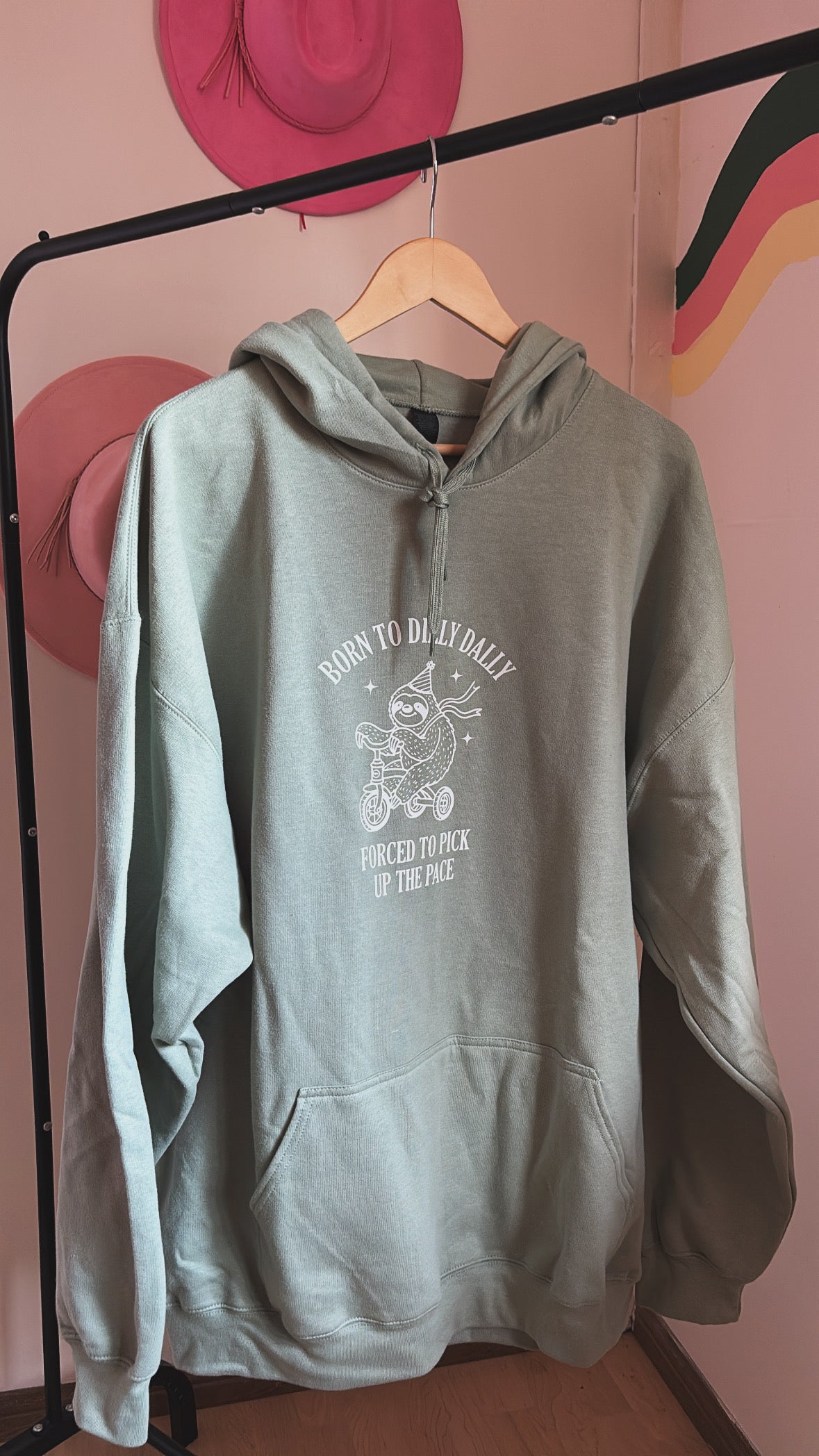 This hoodie is for the slowpokes, the dreamers, and anyone who’s ever been forced to pick up the pace. Featuring a party-hat-wearing sloth zooming (reluctantly) on a tricycle, our “Born to Dilly Dally” hoodie is cozy, witty, and painfully relatable.